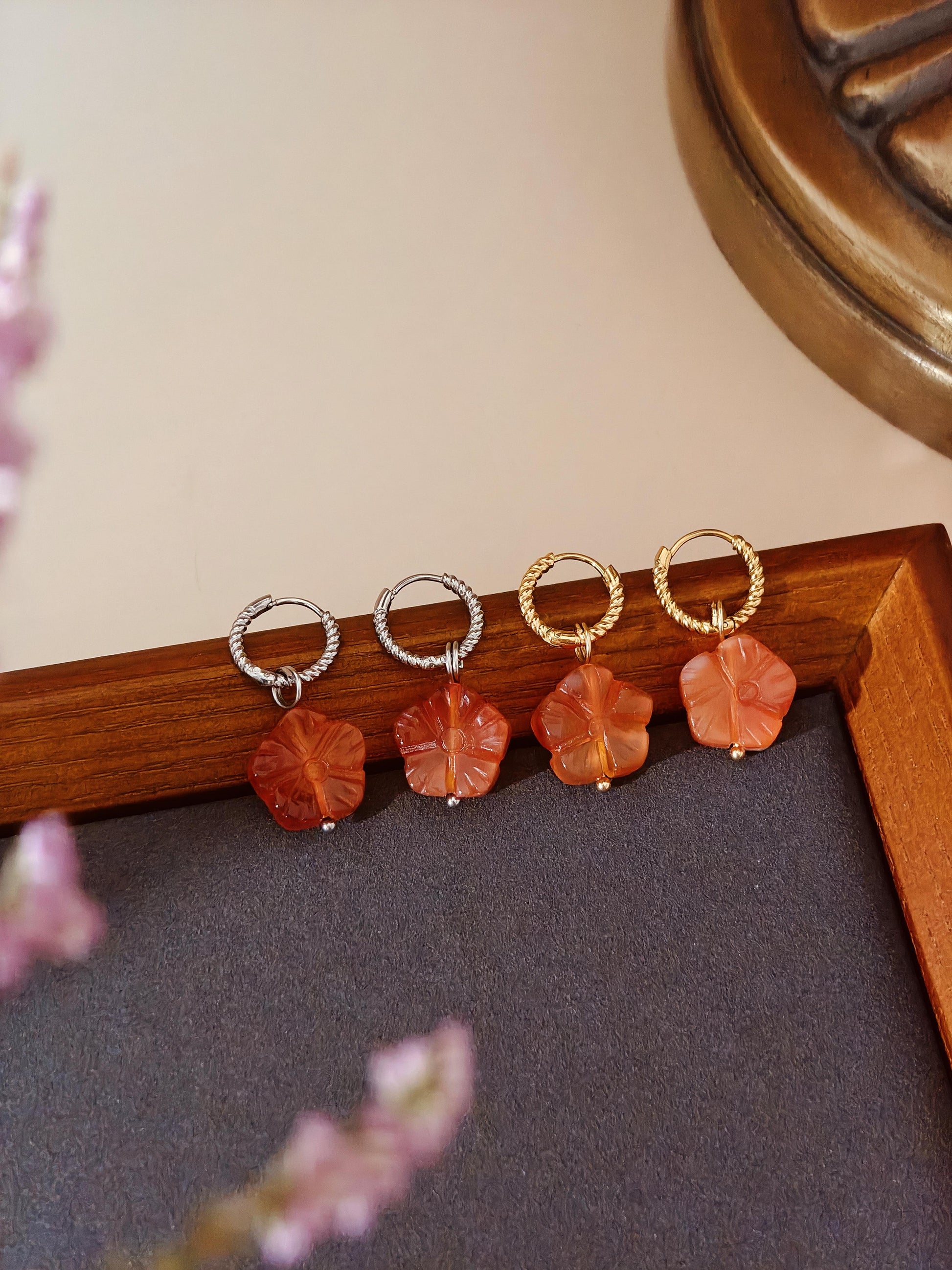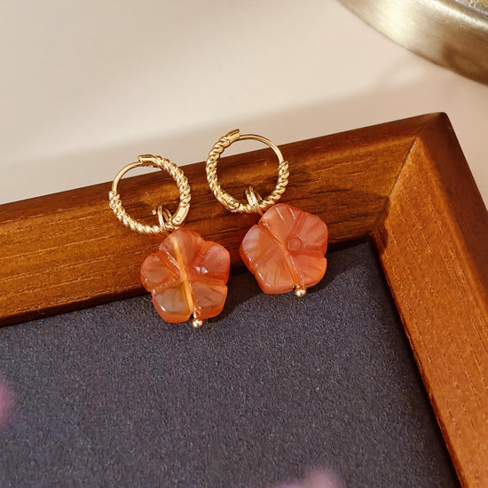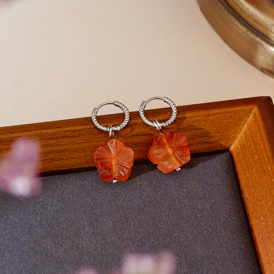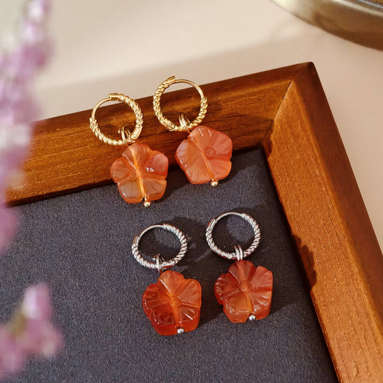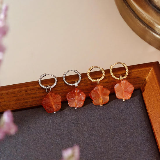 ✧ Awaken your spirit with the warmth of carved carnelian, where each petal whispers of vitality and grace. This enchanting set features hand-carved flower blossoms in natural carnelian—known for its energizing glow and grounding strength. Suspended from sleek stainless steel or 18k gold-plated accents, bloom with timeless elegance and earthy soul.