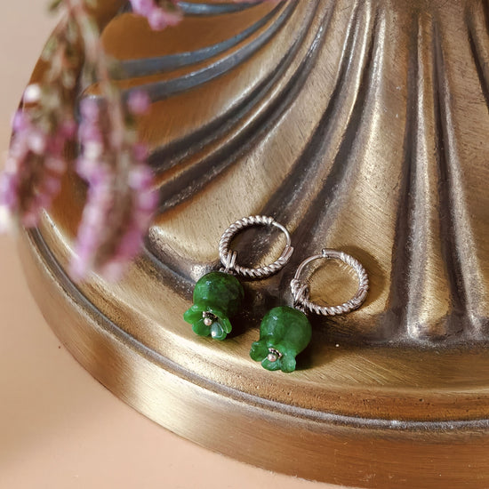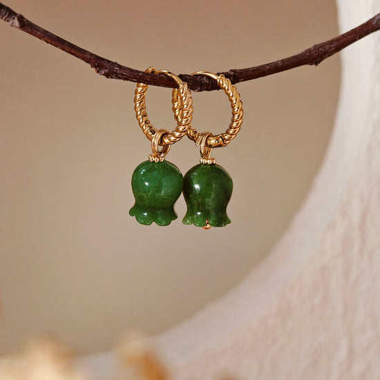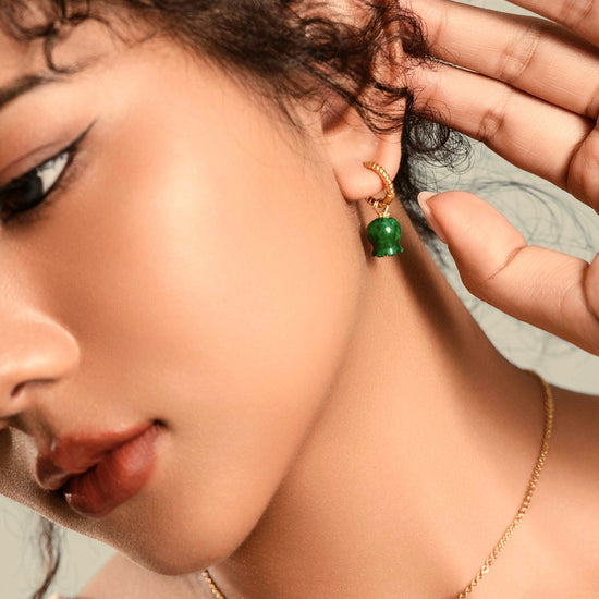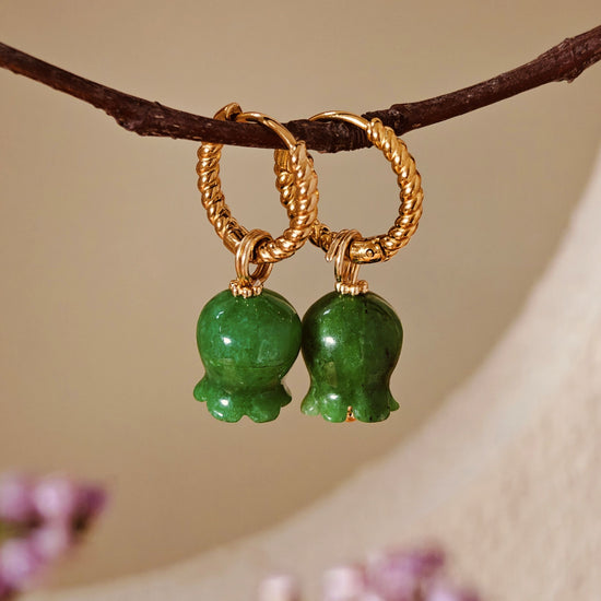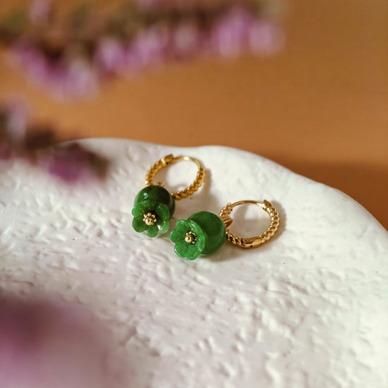 These handcrafted huggie hoops are a celebration of quiet elegance. Twisted for texture and movement, each hoop is forged from stainless steel and plated in radiant 18k gold—offering lasting brilliance and resistance to tarnish. Nestled within the golden curve, a sculptural lily bloom cradles a natural green Jade gemstone, smooth and luminous like moonlight on silk.