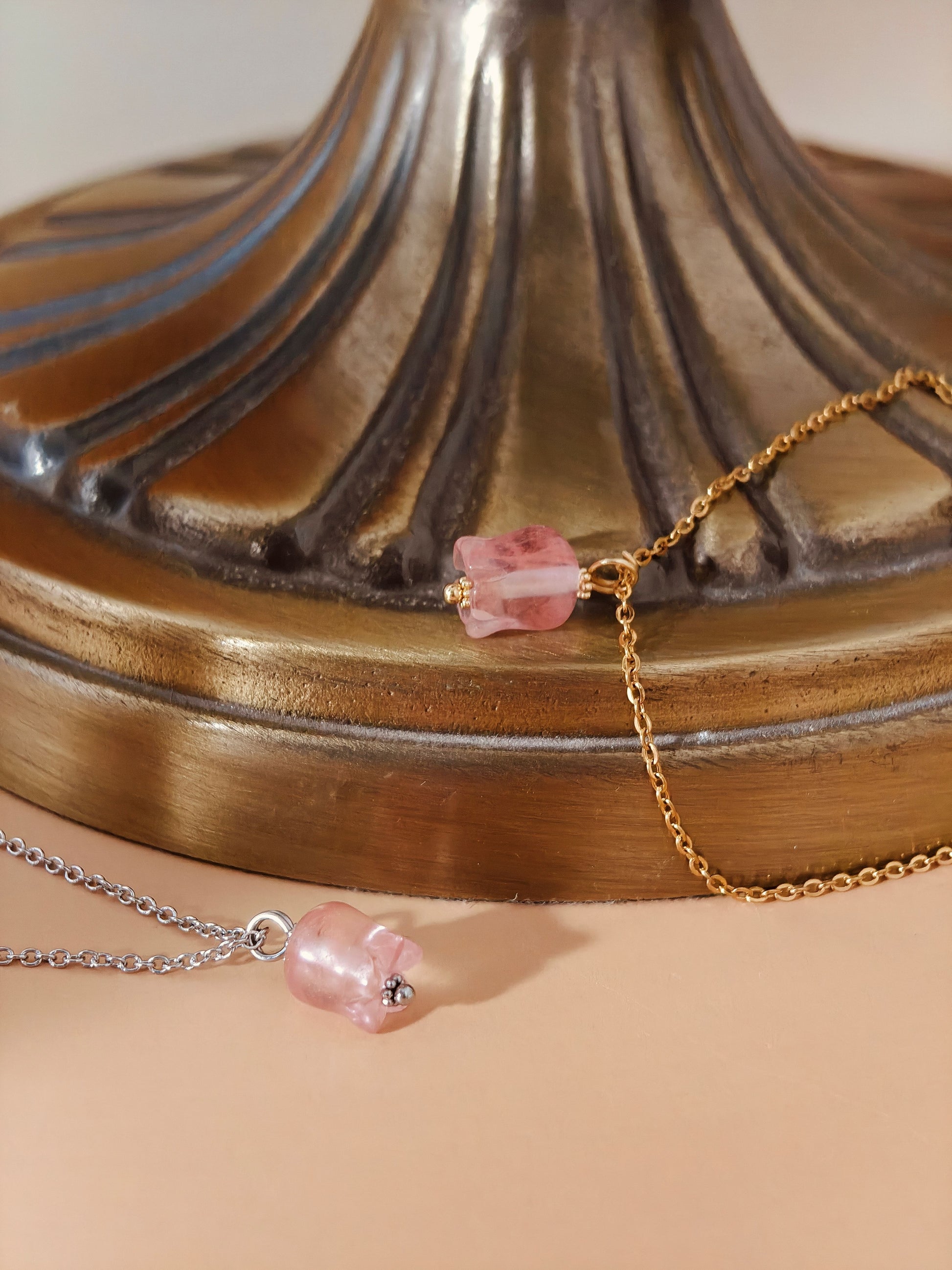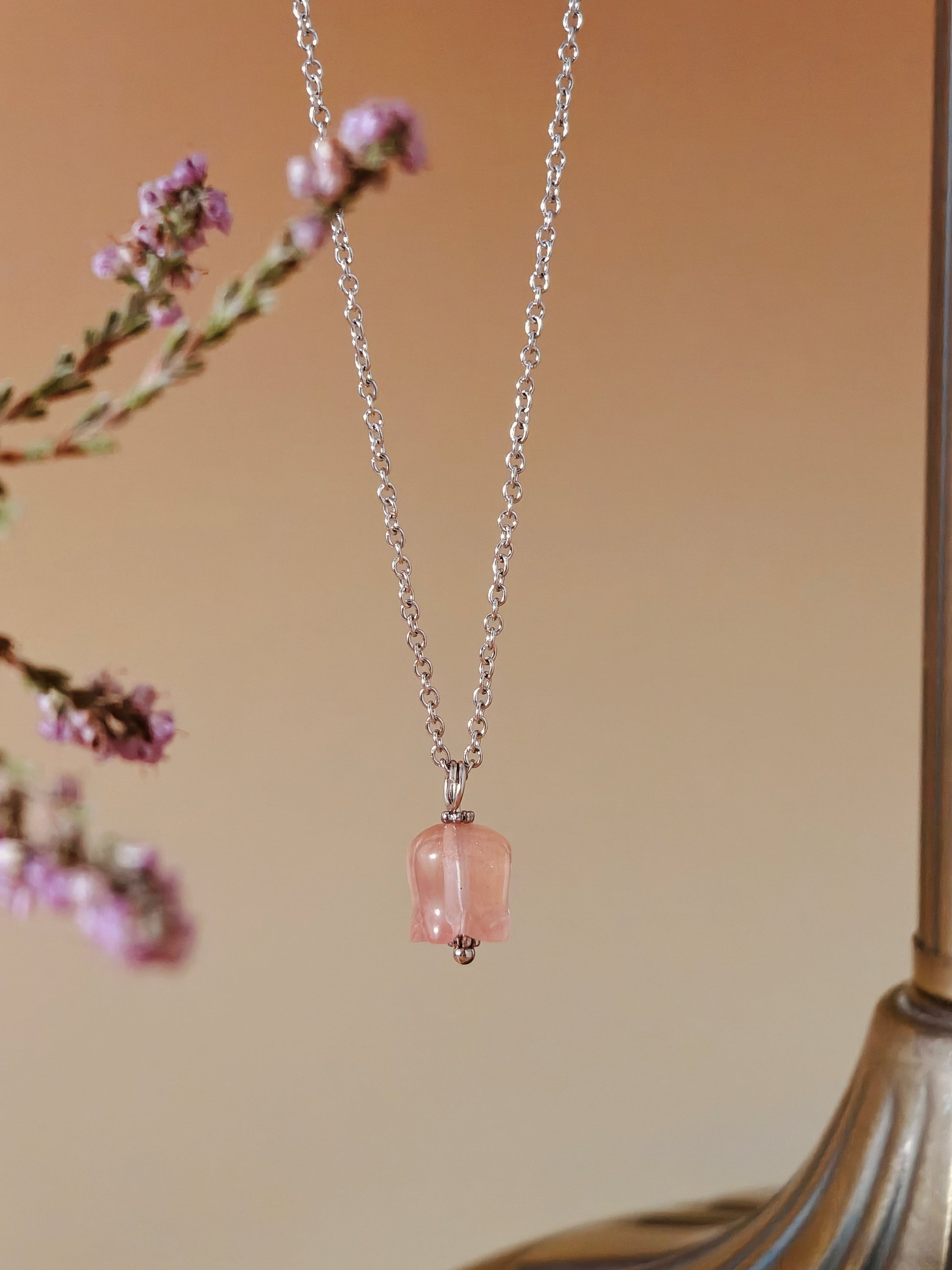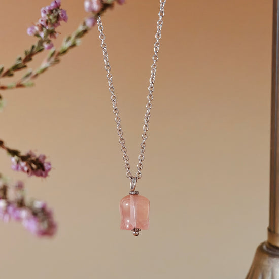 Rose Quartz, known as the stone of unconditional love, radiates warmth and emotional healing. Paired with the lily—an emblem of purity and transformation—this piece becomes a wearable poem of renewal and tenderness. Suspended from a matching chain, it’s perfect for those who cherish beauty with soul.