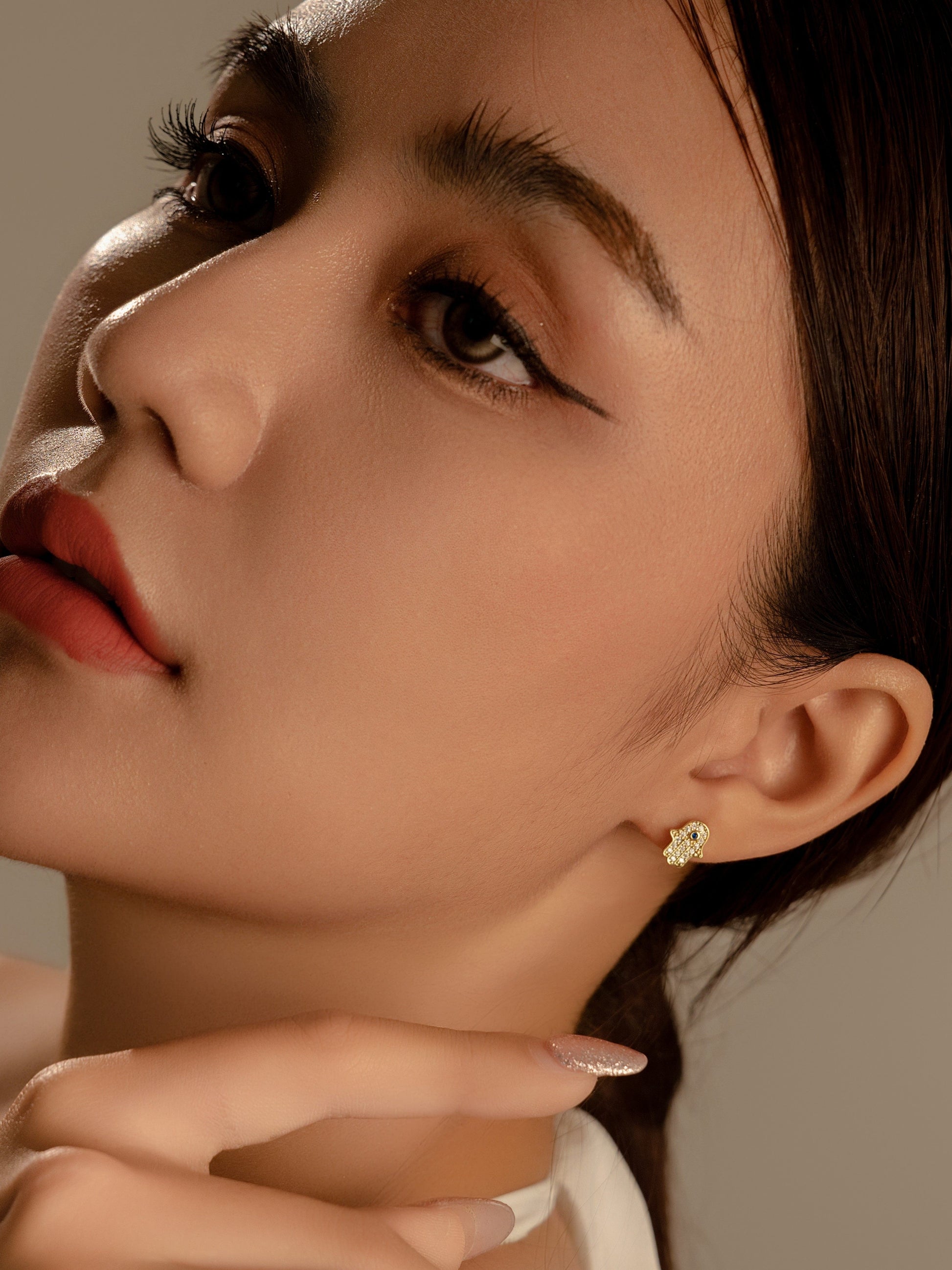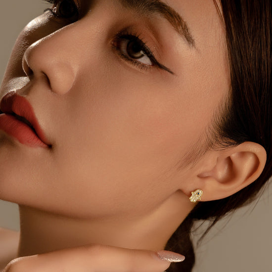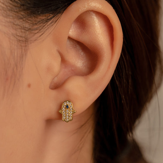✧ A symbol of protection, peace, and divine guidance—these Hamsa hand stud earrings are more than adornment; they’re a talisman for the soul. Crafted in 18k gold-plated brass, each earring gleams with warmth and intention. The iconic hand silhouette is delicately traced with shimmering cubic zirconia, culminating in a radiant blue centerpiece that evokes the watchful eye—an ancient emblem of warding off negativity