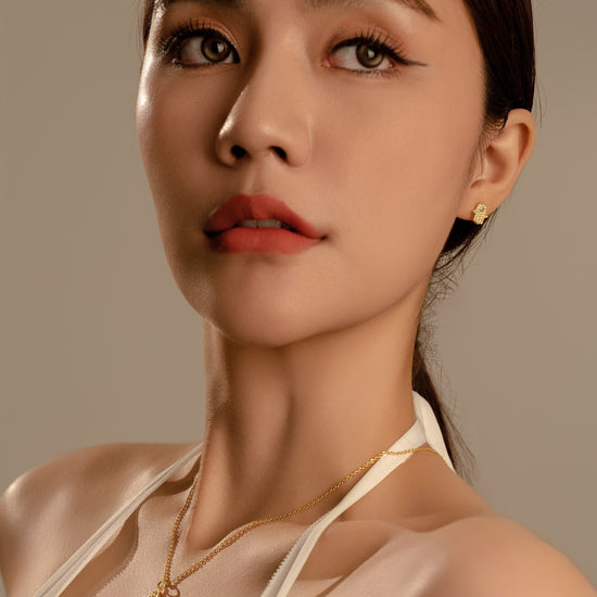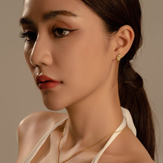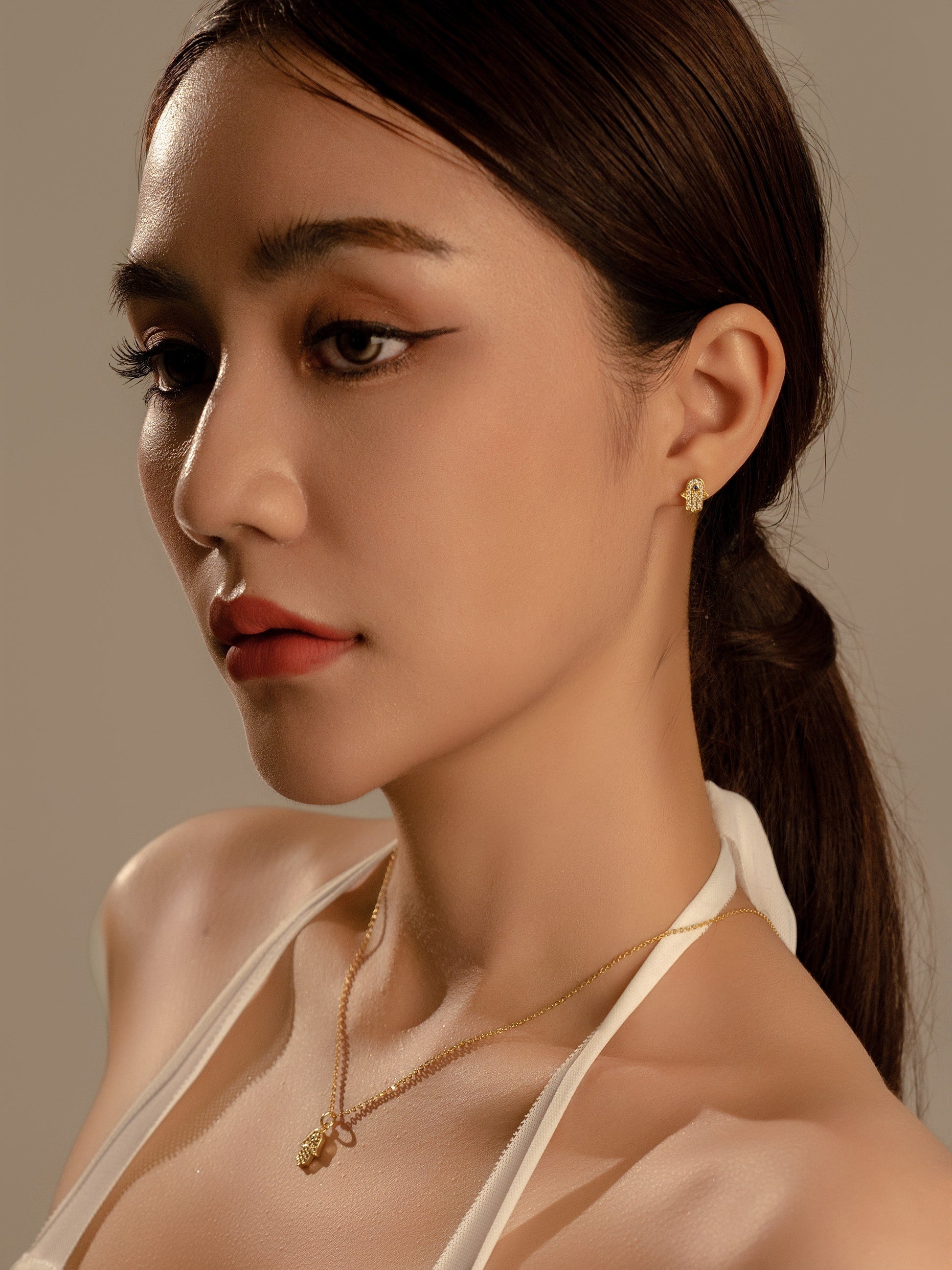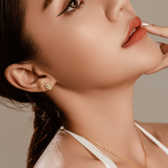 ✧ A symbol of protection, peace, and divine guidance—these Hamsa hand stud earrings are more than adornment; they’re a talisman for the soul. Crafted in 18k gold-plated brass, each earring gleams with warmth and intention. The iconic hand silhouette is delicately traced with shimmering cubic zirconia, culminating in a radiant blue centerpiece that evokes the watchful eye—an ancient emblem of warding off negativity