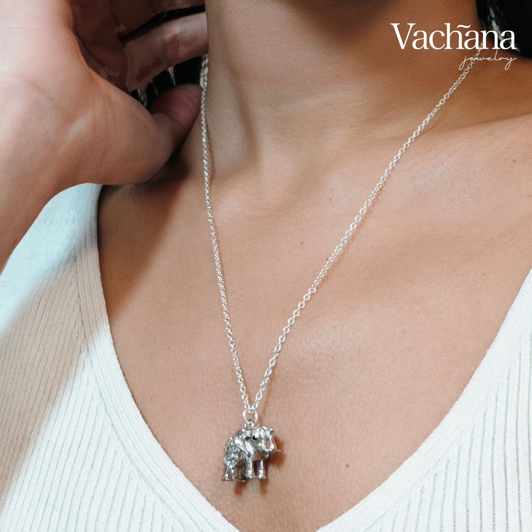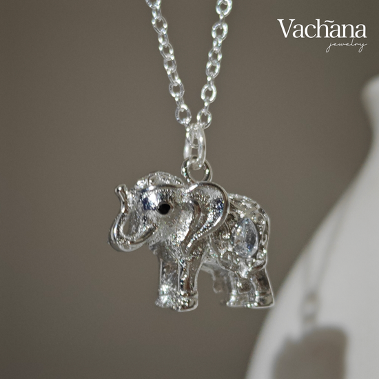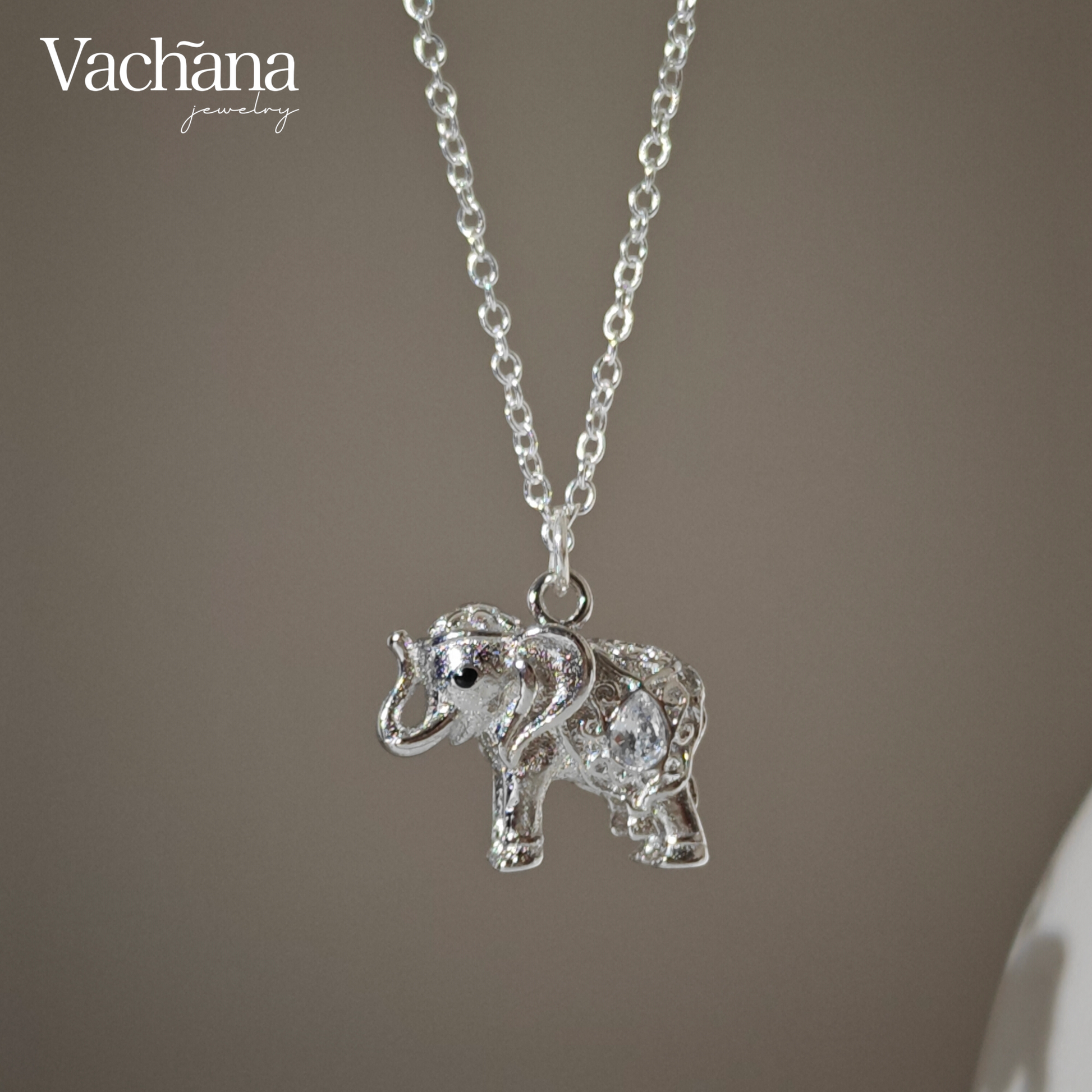 - Design: Features a detailed 7g elephant pendant, symbolizing good luck, strength, and wisdom. Adorned with two teardrop-shaped clear cubic zirconia crystals on either side of the body, and a touch of black enamel paint to highlight the eyes.