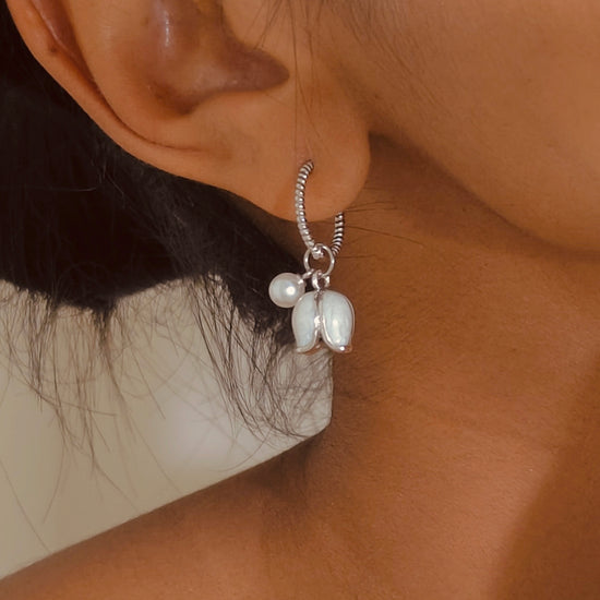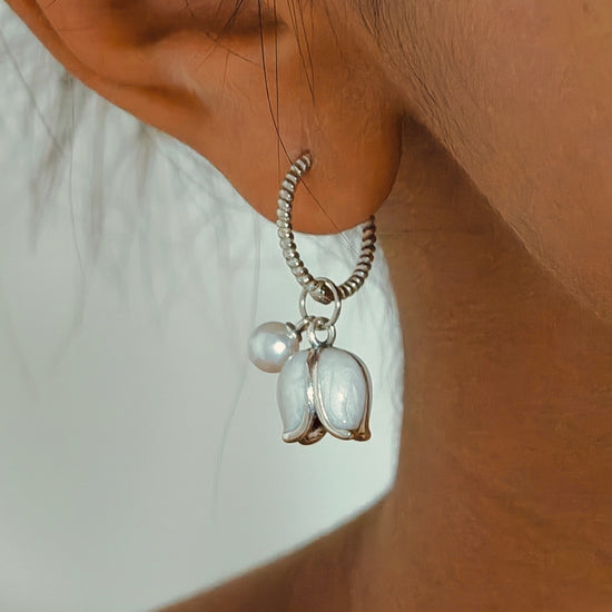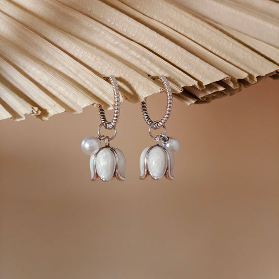 Vachana - White Enamel Lily & Pearl Huggie Hoop Earrings